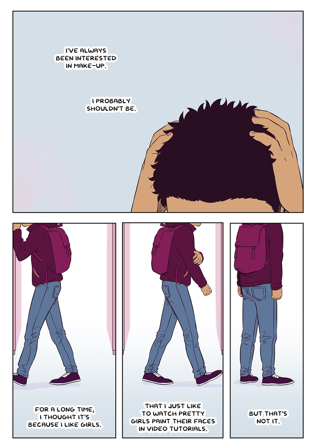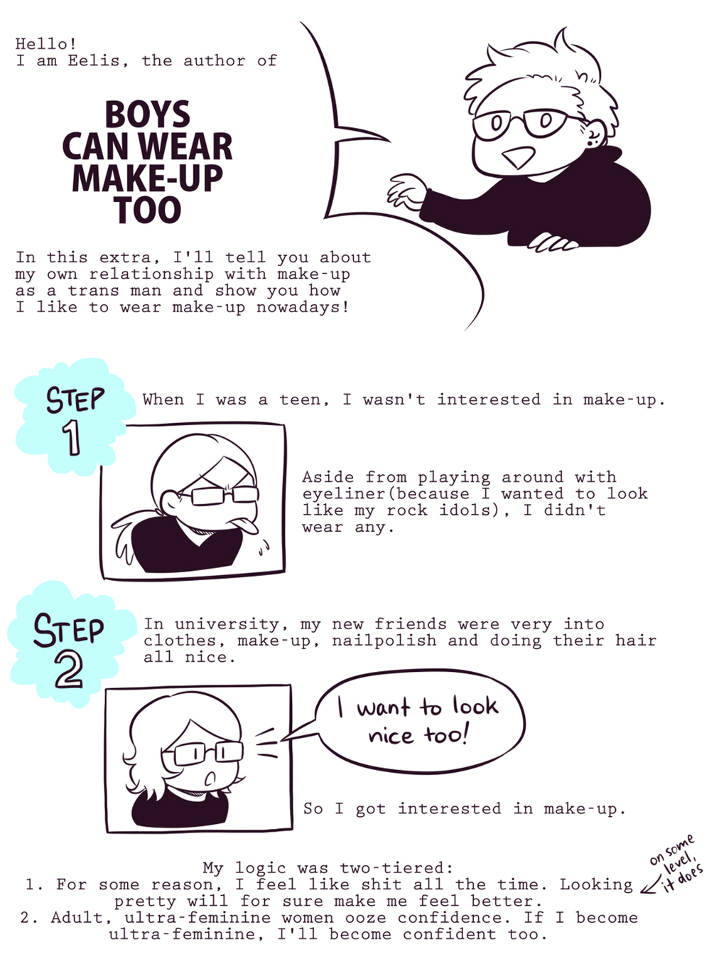 This comic was first published as a part of the Monthly OneShot series, but this version has a 4 page extra comic by Eelis. In the extras he talks about his own relationship with make-up as a trans man.